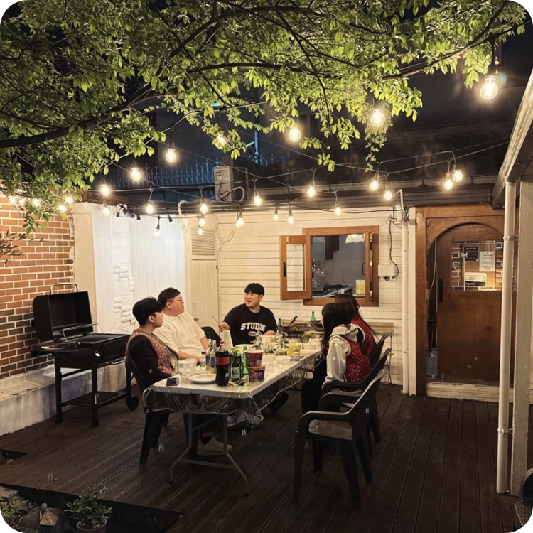 고즈넉한 한옥 라인과 브릭월이 포근한 분위기를 만들며, 단체 바비큐 파티에 최적화된 구조예요.