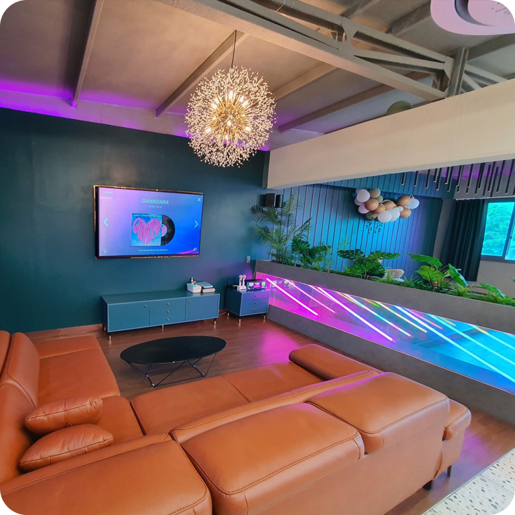 파스텔톤 베이스와 네온 조명의 조합이 돋보이는 트렌디한 복합 라운지입니다.