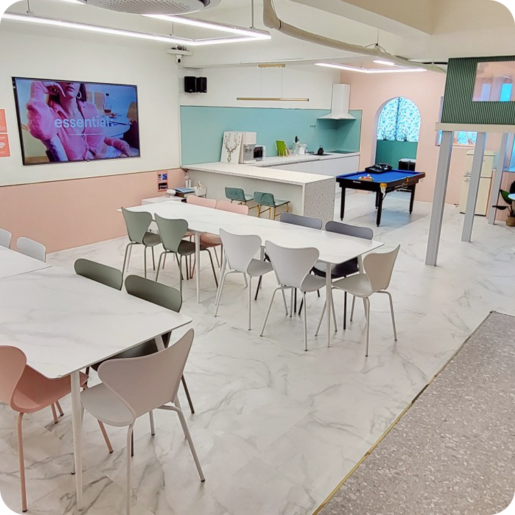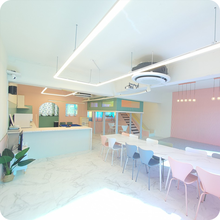 대형 테이블과 다양한 컬러 체어들이 조화를 이뤄, 워크샵부터 파티까지 폭넓게 대응합니다.