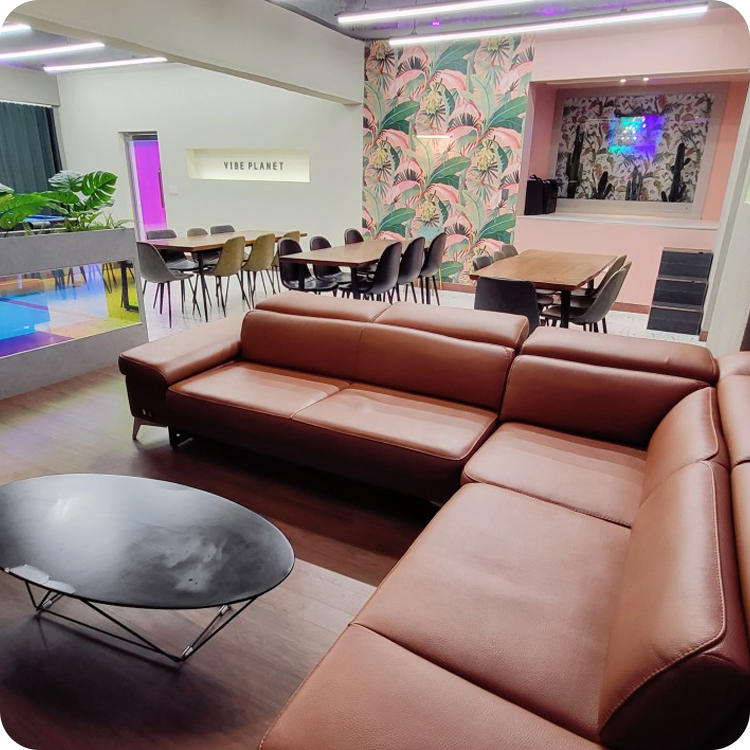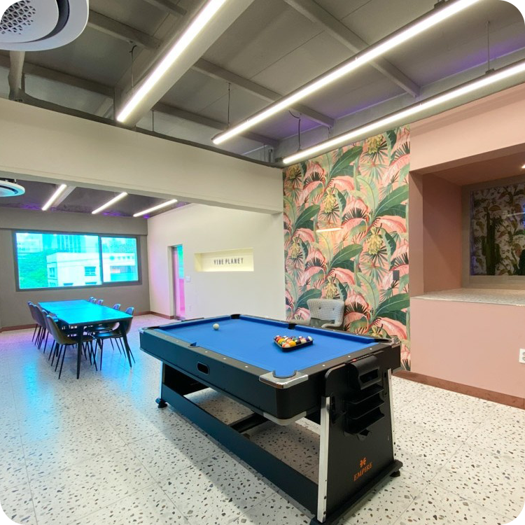 포켓볼 테이블·라운지 소파·포토존까지 갖춰 다목적 활용이 가능한 공간으로, 층고 높은 구조와 넓은 동선으로 단체 행사도 여유롭게 즐길 수 있는 감각적 플레이 라운지입니다.