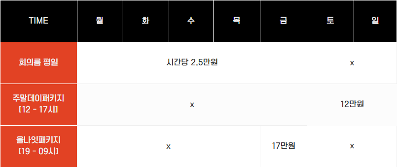 | 회의룸 이용 시 책상&의자(1600*600책상6개&1200*400책상8개&1인용책상6개), 120인치 빔프로젝터, 50인치 TV(HDMI연결 가능), 마샬스피커, 빔포인터, 화이트보드 2개, 프린터, 사무용품, 캡슐커피 제공 |