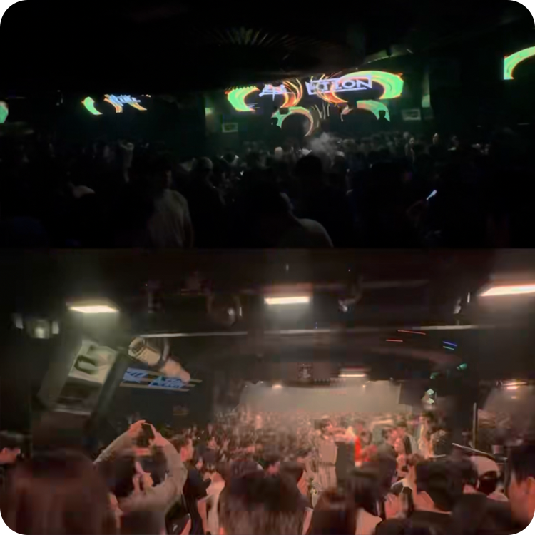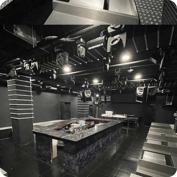 강렬한 비트와 웨이브형 천장 조명이 어우러진 에너지 넘치는 공간입니다.
