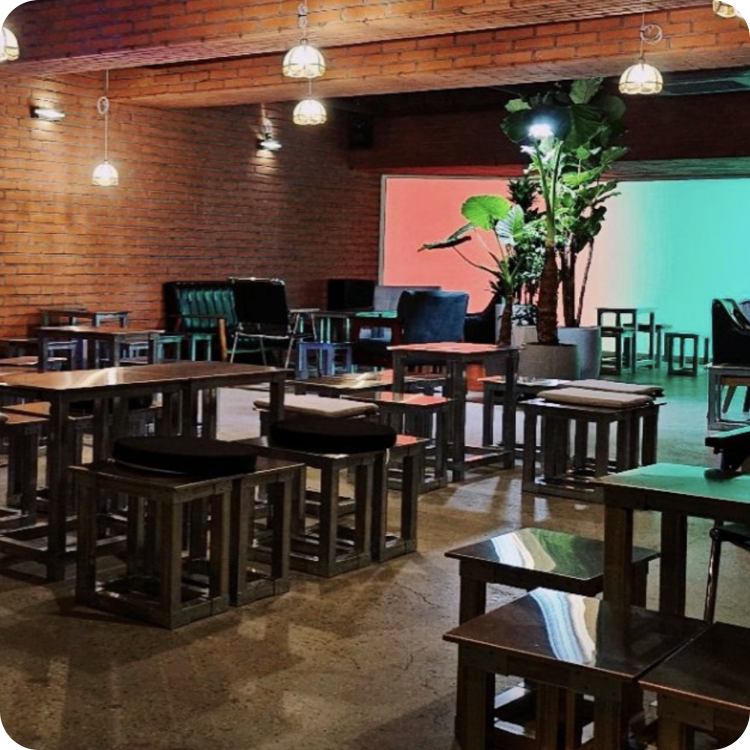 낮은 메탈 테이블과 편안한 좌석이 여유로운 분위기를 만들며, 무대형 전면 라이트 존이 있어 토크·공연·파티 연출에 용이합니다.