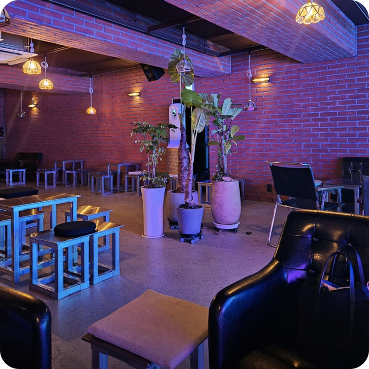 따뜻한 브릭 인테리어와 깊이 있는 블루 백라이트가 조화를 이루는 감각적 공간입니다.