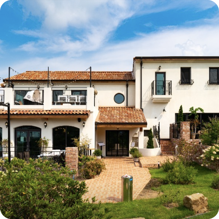 푸른 자연 풍경과 어우러진 전원형 빌라 스타일의 라운지 공간입니다.