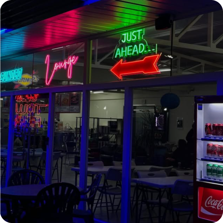 네온 사인과 빈티지 컬러가 어우러진 아메리칸 레트로 무드의 대형 라운지 공간입니다.