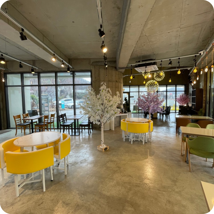 콘크리트 텍스처와 따뜻한 우드 가구가 어우러진 감성적인 카페형 공간입니다.