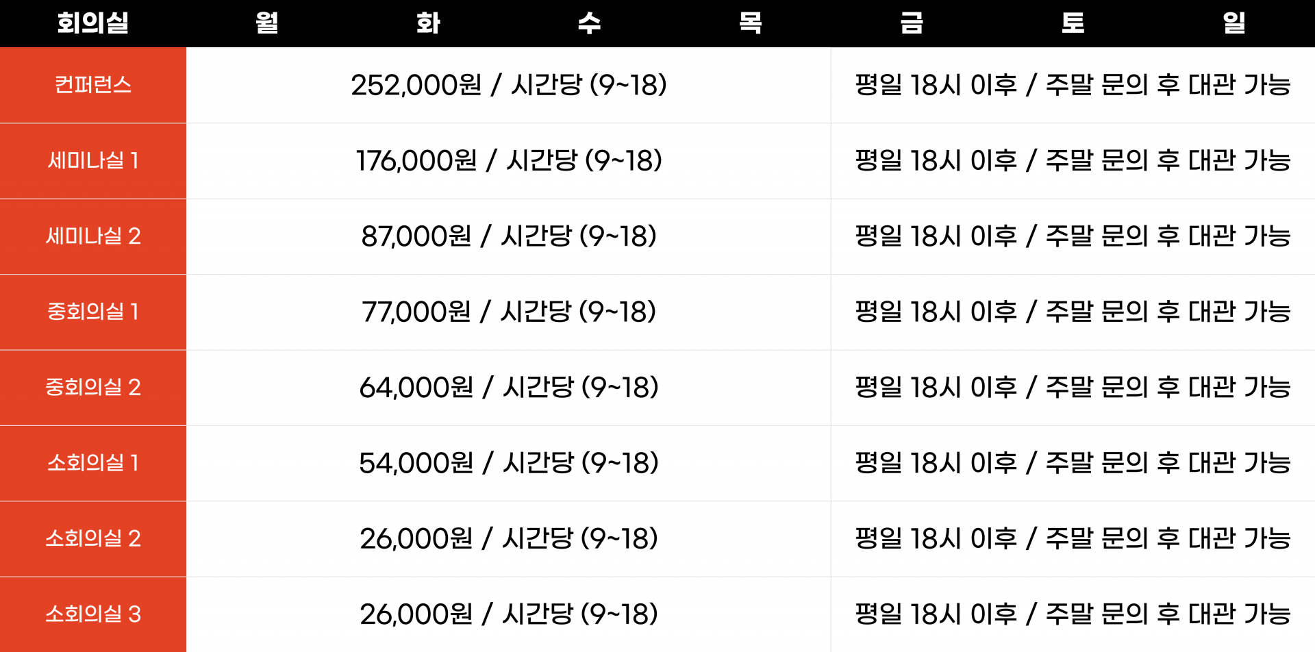 | 컨퍼런스 (9:00~18:00) | 252,000원 / 시간당 | 문의 후 대관 가능 | |||||