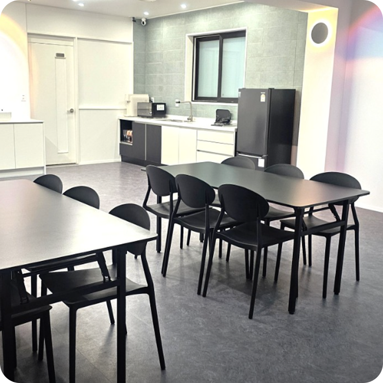 넓은 블랙 다이닝 테이블 세트와 효율적인 키친 공간이 마련되어 있어 단체 회식, 워크샵, 동호회 모임 등 인원이 많은 행사도 여유롭게 수용 가능합니다.