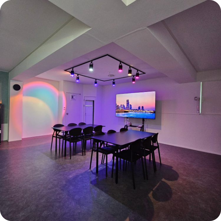 천장의 컬러풀한 스포트라이트와 대형 디스플레이가 설치되어 있어, 단순한 모임을 넘어 미디어 상영이나 시각적인 퍼포먼스가 필요한 파티에 최적화되어 있습니다.