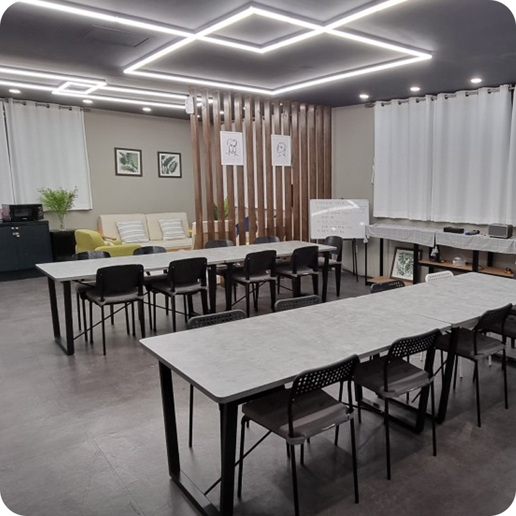 ![]() | 영상 상영회 & 스터디 빔프로젝터 활용이 용이한 최적의 구조 | ![]() | 팀빌딩 & 아이디어 회의 집중력을 높여주는 모던한 조명과 넓은 테이블 |