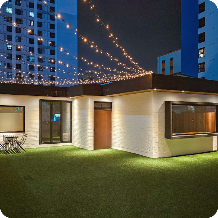 넓게 펼쳐진 인조잔디 테라스 위로 쏟아지는 스트링 라이트가 로맨틱하고 이국적인 분위기를 완성합니다.