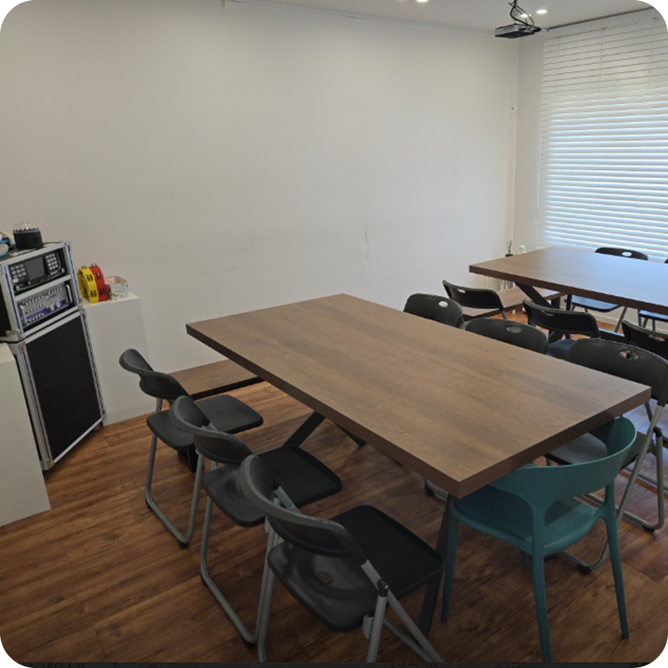 ![]() | 냉장고, 전자레인지, 전기포트, 냉온 정수기 등 구비 | ![]() | 대형 원목 테이블, 편안한 소파공간 구비 |