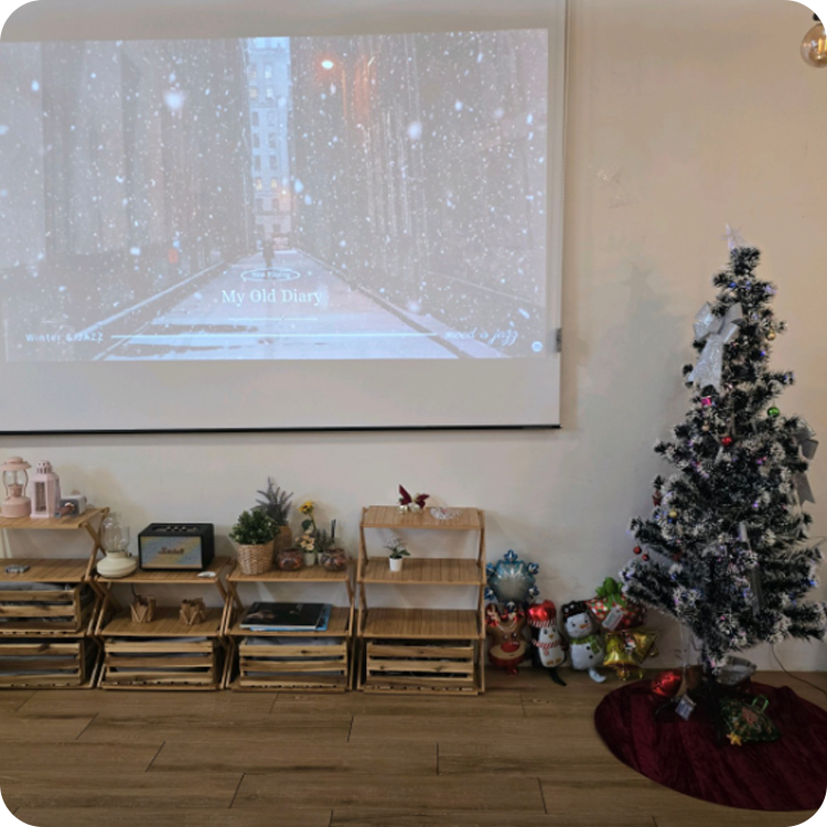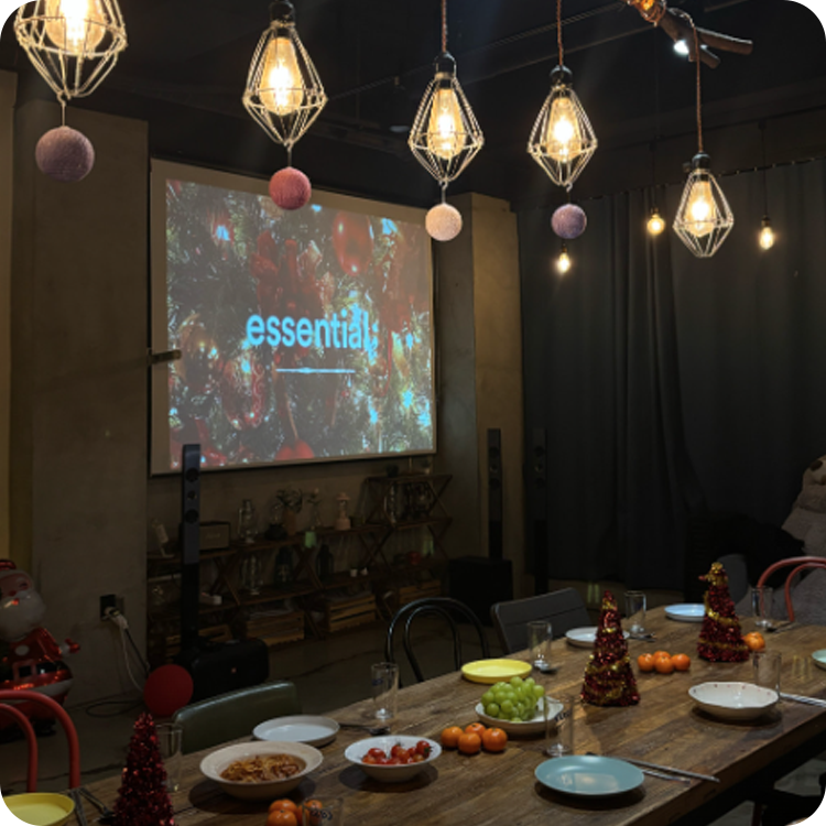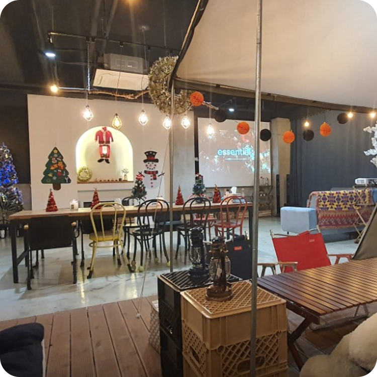 넓은 공간 중앙에 배치된 대형 우드 테이블은 대화가 필요한 워크샵이나 프라이빗한 파티에 최적화되어 있으며, 한쪽 벽면을 가득 채운 빔프로젝터 스크린은 우리만의 영화관이나 발표 공간으로 변신합니다.