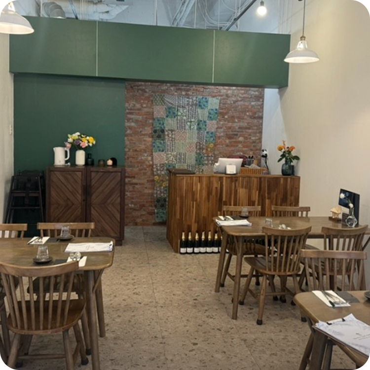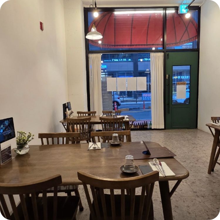 세련된 딥그린 포인트 컬러와 따뜻한 원목 가구가 조화를 이루어, 마치 유럽의 작은 식당에 온 듯한 아늑함을 선사하는 다이닝 라운지입니다.