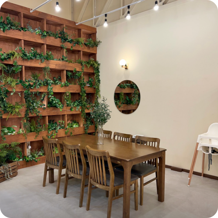 따뜻한 우드 톤의 다이닝 공간과 플랜테리어 벽면은 모임의 품격을 높여주며, 화이트 톤의 깔끔한 키친 시설이 완비되어 있어 가족 단위 식사나 파티에 최적화되어 있습니다.