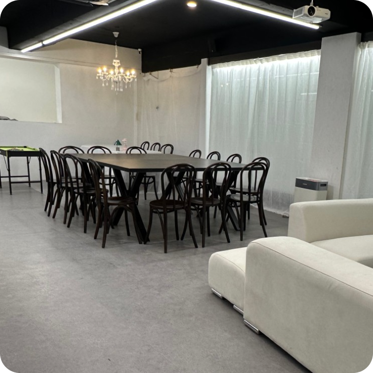 빔프로젝터와 화려한 샹들리에 조명까지 갖추고 있어 낮에는 효율적인 업무 공간으로, 밤에는 분위기 있는 파티 공간으로 변모하는 다목적 멀티 스페이스입니다.