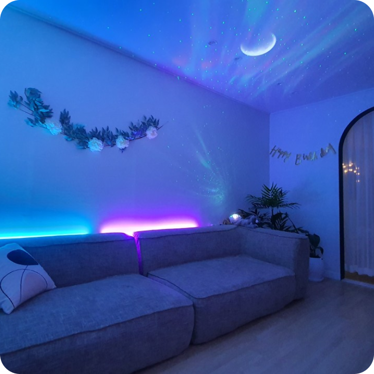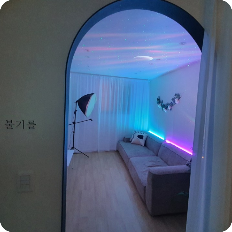 공간 전면에 배치된 대형 TV와 노래방 시스템, 그리고 아늑한 간접 조명은 영화 상영회나 파티의 몰입감을 극대화해 줍니다.