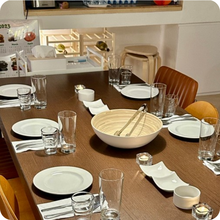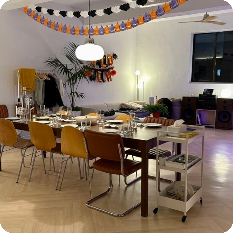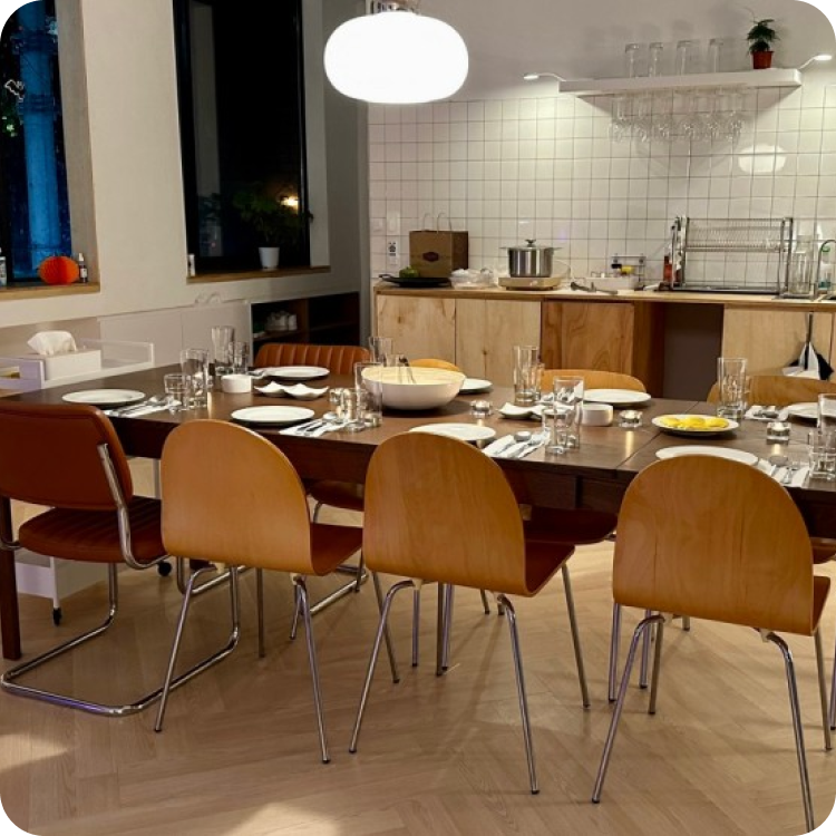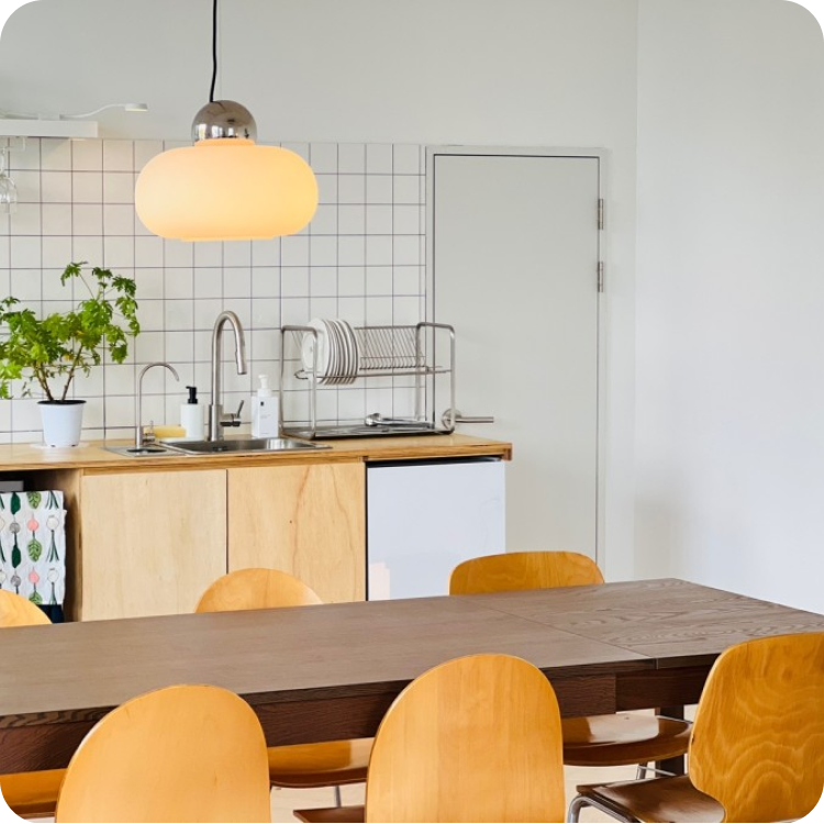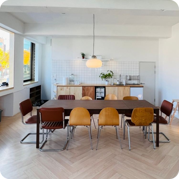 대형 원목 다이닝 테이블은 워크샵, 팀 미팅, 독서 모임 등 비즈니스와 사적 모임 모두를 수용할 수 있는 넉넉함을 자랑합니다.