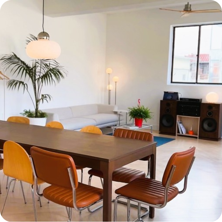 ![]() | 기업 워크샵 & 팀 미팅 넓은 원목 테이블과 집중도를 높이는 정갈한 분위기 | ![]() | 유튜브 & 상업 촬영 미드센추리 모던 가구와 따뜻한 자연광이 조화로운 배경 |