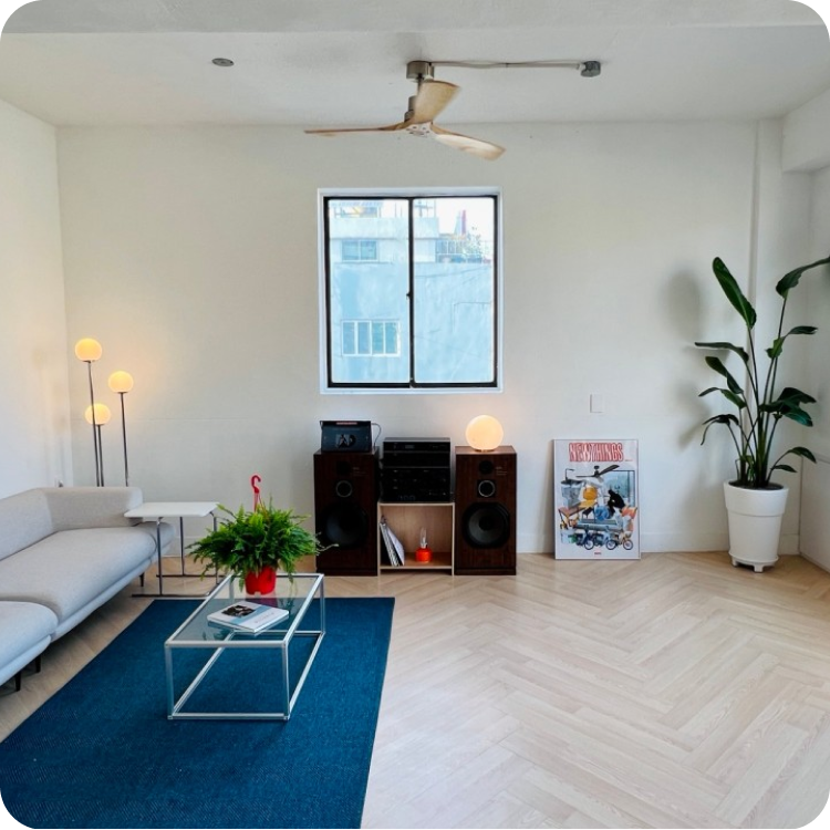 빈티지한 오디오 스피커와 감도 높은 조명, 세련된 실내 식물들이 배치되어 있어 어느 각도에서나 수준 높은 콘텐츠 촬영이 가능합니다.