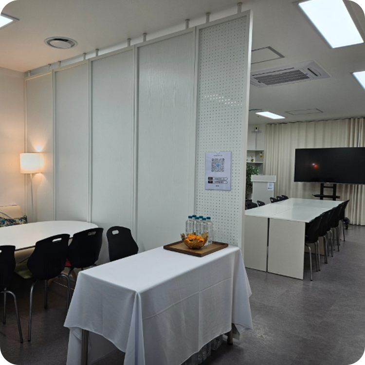 가변형 파티션을 통해 공간을 유연하게 활용할 수 있으며, 장시간 회의에도 편안한 대형 테이블과 좌석이 마련되어 있습니다.