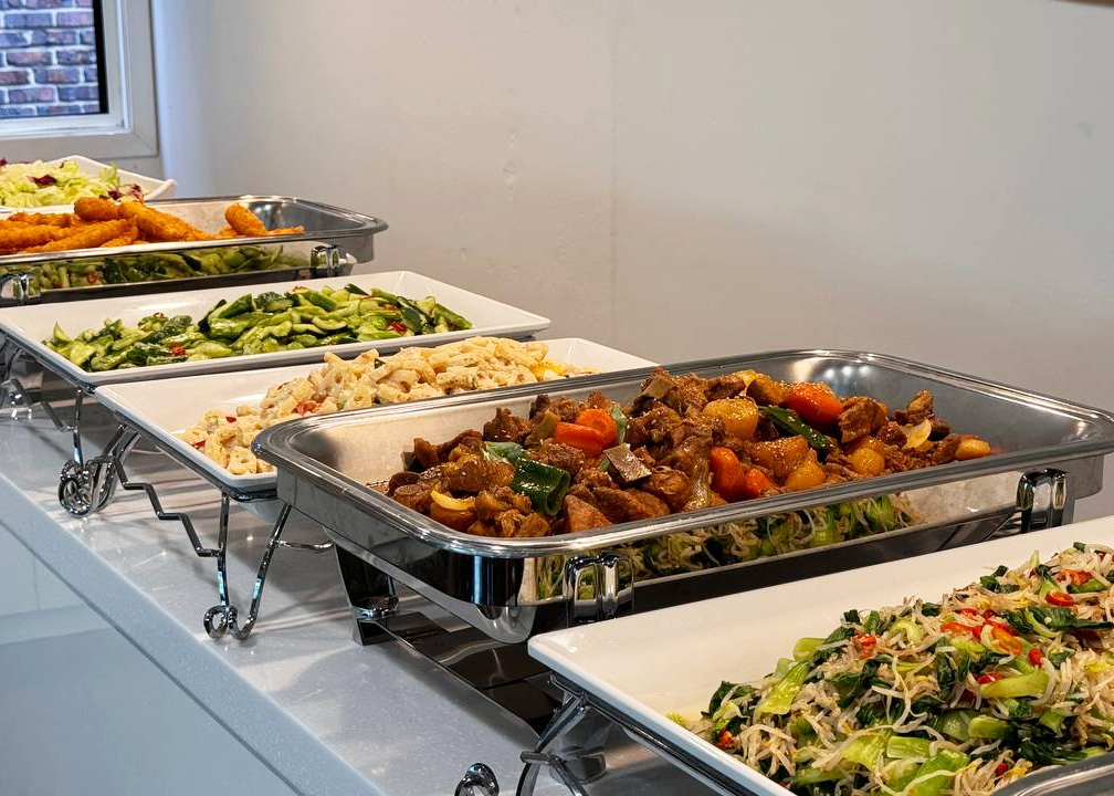 따뜻한 음식은 고체 연료로 현장에서 온도를 유지하며, 전문 셰프의 현장 조리와 깔끔한 테이블 세팅까지 포함됩니다.
