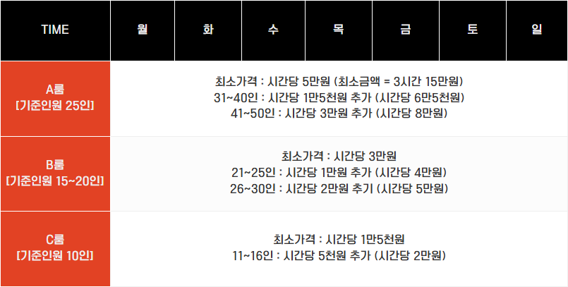 * 최소 이용시간 3시간 / 주류 또는 식사류 반입 시 시간당 1만원 요금 추가