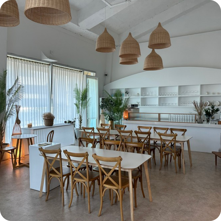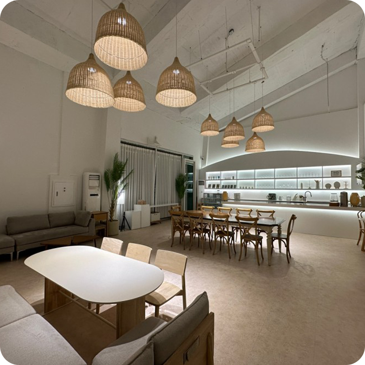 화이트톤 인테리어와 라탄 조명이 조화를 이루는 감성적인 공간입니다.