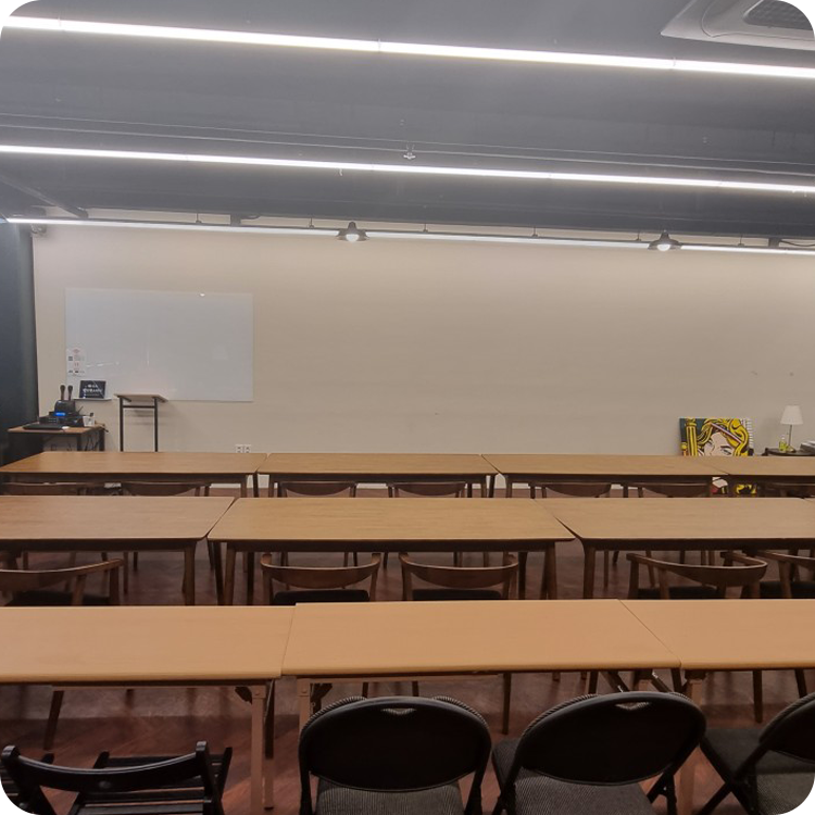 천장 라인조명이 깔끔하고 균일한 밝기를 유지해 강연·교육·워크샵 모두에 최적화되어 있습니다.