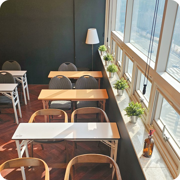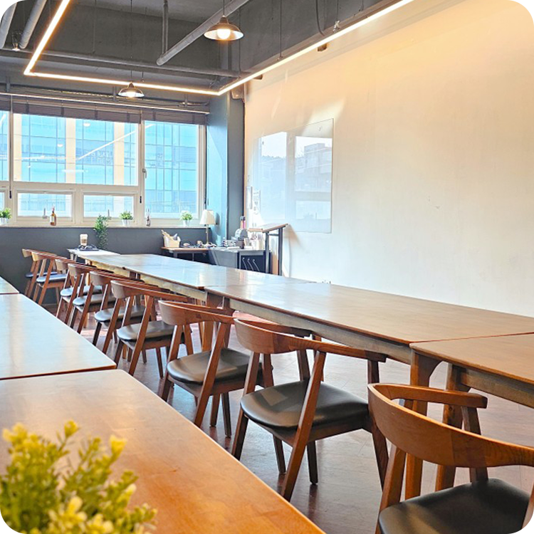 대형 프로젝터와 화이트보드, 넉넉한 테이블 배치로 단체 행사·세미나까지 안정적으로 운영할 수 있으며, 넓은 창가에서 들어오는 자연광은 집중도 높은 학습 환경과 촬영용 무드까지 완성해줍니다.